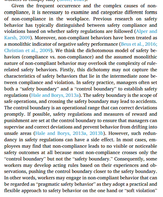 Further, research has treated “non-compliant behaviors as a monolithic source of unsafety and a negative safety performance indicator”, but this doesn’t adequately separate intention and non-intentional, or reckless/malevolent versus non-reckless departures, nor departures that were not linked to a known and appreciated risk awareness