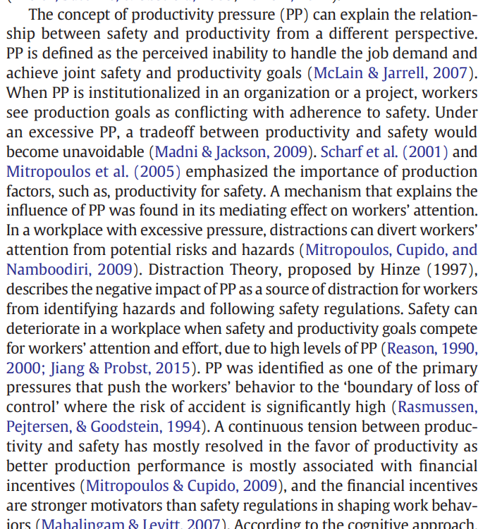 For example, Lean may help improve productivity but may also “indirectly endanger the safety of laborers by increasing the level of PP” (p108). PP is Productivity Pressure, being the perceived inability to handle job demands and achieve both safety & productivity goals.