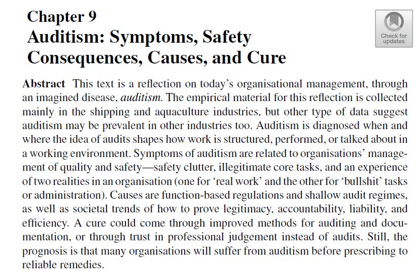 Moreover, “A symptom of auditism is to not recognise that ill-fitting management systems might work against the objective of the system”. Also, evaluating safe work (how core tasks are performed safely), is often difficult to audit; hence auditism results in more safety work via extra tasks in order to evaluate products of work.