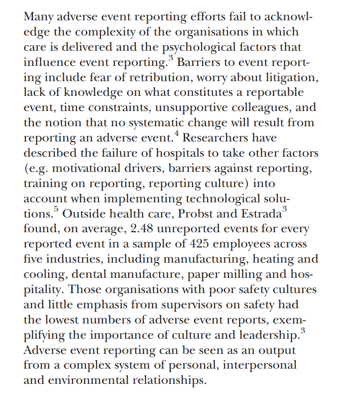 They argue that “Because adverse event reporting is shaped by relationships and culture external to the individual, it should be viewed as an organisational as much as a personal function”.