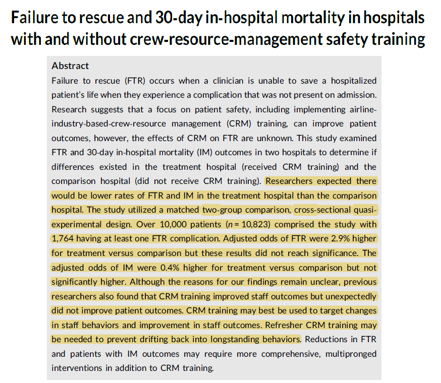 They cite evidence that activities like follow-up debriefings after FTR events to be crucial to effective team comms and maintaining the principles of CRM training in organisations. This CRM intervention didn’t include a standardised post-event debrief as part of its curriculum.