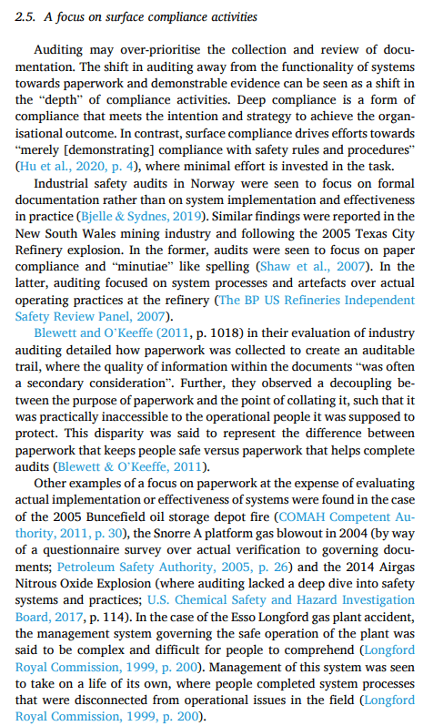 · Blewett and O’Keeffe (2011, p. 1018) in their evaluation of industry auditing detailed how paperwork was collected to create an auditable trail, where the quality of information within the documents “was often a secondary consideration”.