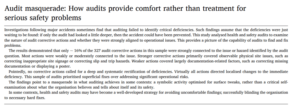 · While many different types of audits exist, with different goals and scopes, one line of argumentation is that “audits should not overly concentrate on compliance against administrative aspects of the system and documentation. Rather, … audits should prioritise addressing tangible and intangible factors linked to actual characteristics, states, influences, objects, or practices to enhance the efficacy of the safety management system in achieving health and safety goals“