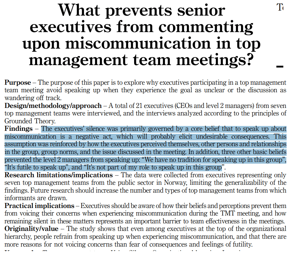This interesting study explored such factors of silence among 21 CEOs and senior managers across 7 firms.