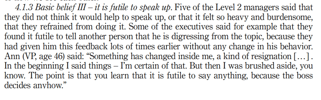Prior research found that silence was linked to feelings of fear and feelings of futility, 1) fear of being labelled or viewed negatively, or of retaliation, 2) feelings of futility, having a sense that speaking up won’t make a difference.