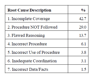 According to the below figure, 42% of procedural issues stemmed from there being an incomplete coverage of the procedure versus the necessary tasks. Reports suggested that 29% of procedural issues had their roots in people not following the procedures (which naturally leads us to question why and how)?