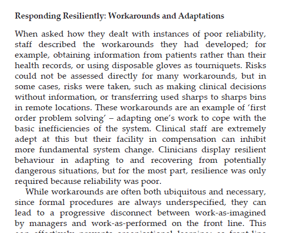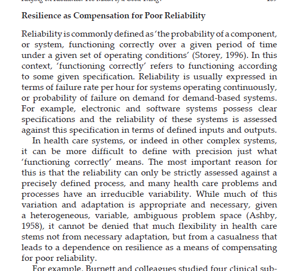- Resilience may act as compensation for poor reliability, and under the assumption that ‘people will sort it out’ (inadequate and ill-fitting designs, resource constraints, trade-offs etc)
