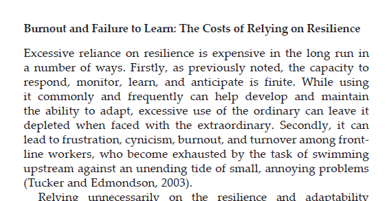 - An organisation may depend on resilience too much for achieving routine success, “frittering away a valuable adaptive resource on the everyday that might better be husbanded for greater or less tractable threats”