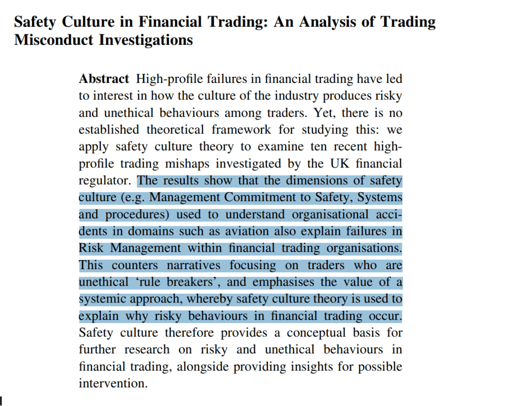 One thought on “Safety Culture in Financial Trading: An Analysis of Trading Misconduct Investigations”