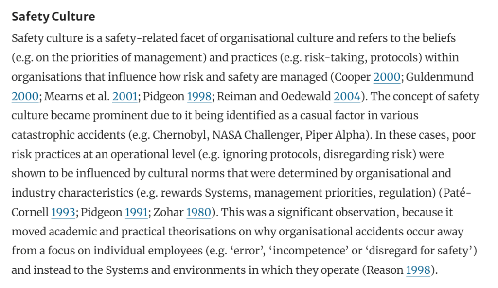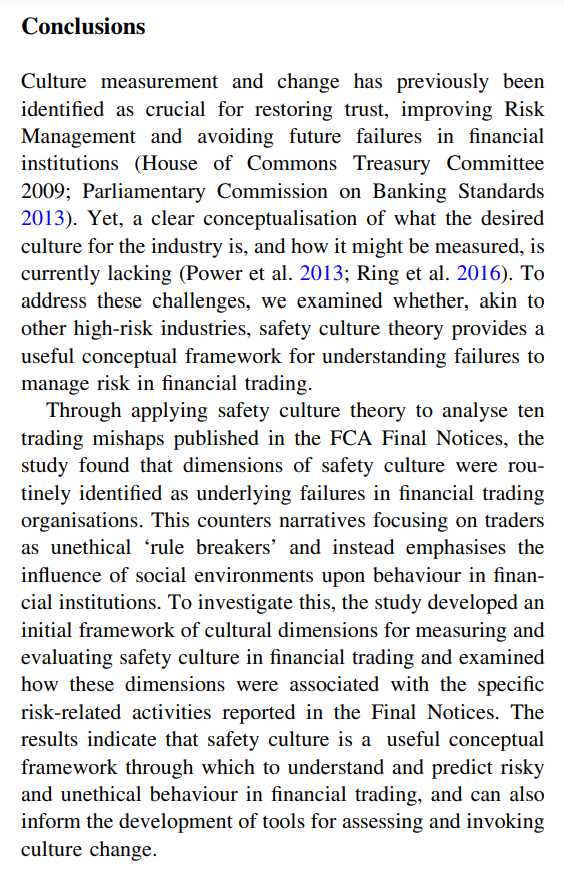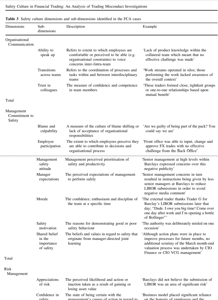 Ref: Leaver, M. P., & Reader, T. W. (2019). Safety culture in financial trading: An analysis of trading misconduct investigations. Journal of Business Ethics, 154, 461-481.
