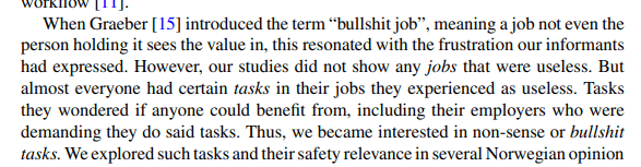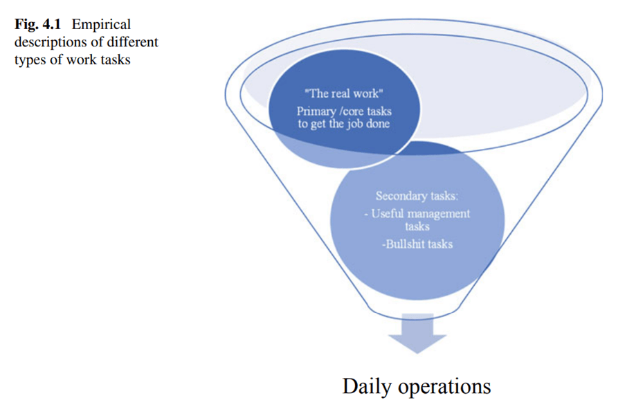 - People often reported not seeing the purpose of their bullshit tasks, with outputs “seemingly disappearing into a “black hole”; including extensive documentation of simple routine chores or reporting in systems they never saw anybody use
