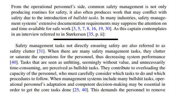 - This is driven by how organisational and technological systems encourage a shift in safety management away from the sphere of people and their “real work”, towards bullshit tasks