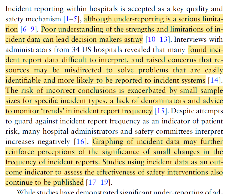 Providing background on incident reporting systems, they argue that “under-reporting is a serious limitation …[6–9]. Poor understanding of the strengths and limitations of incident data can lead decision-makers astray”.