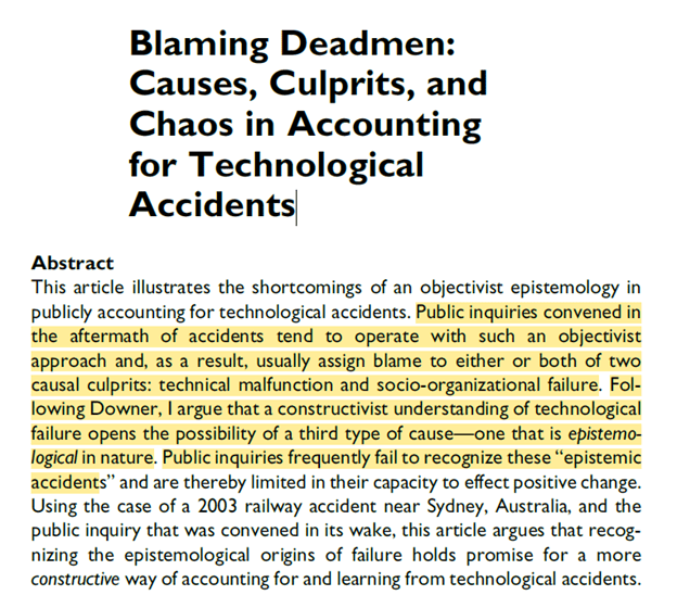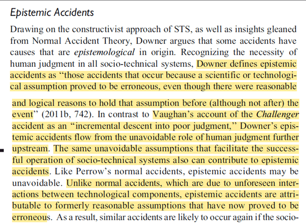 John Downer’s work on epistemic accidents is discussed. These are “accidents that occur because a scientific or technological assumption proved to be erroneous, even though there were reasonable and logical reasons to hold that assumption before (although not after) the event’’.