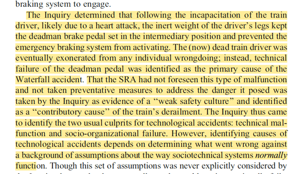 That is, because the inquiry conceptualised the deadman pedal as early warnings of danger, the “prior dealings with the deadman brake were cleansed of the uncertainties that are an integral part of technology practice in sociotechnical systems”.
