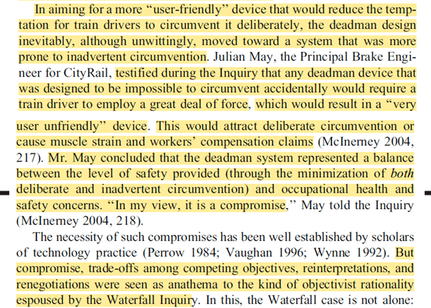 From the company and rail engineering perspective, the deadman was a compromise between minimising both strain and circumvention. But “compromise, trade-offs among competing objectives, reinterpretations, and renegotiations were seen as anathema to the kind of objectivist rationality espoused by the Waterfall Inquiry”.