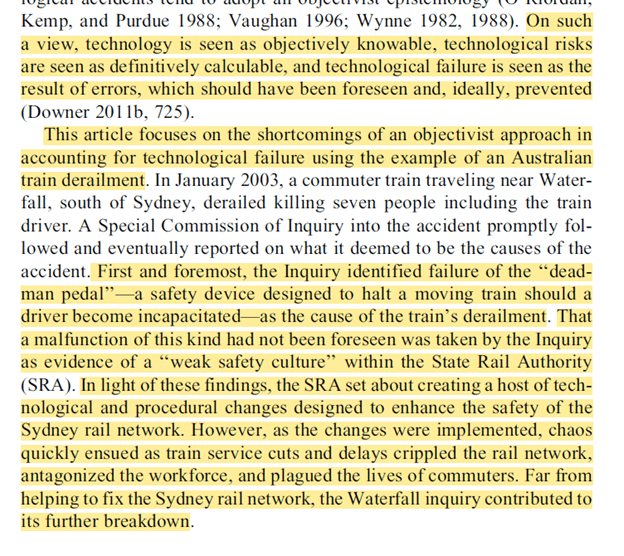 This was a fascinating read, exploring objectivist and constructivist explanations and reflections around the public inquiry into the Waterfall train accident; and namely how a myopic objectivist focus on rational decision-making and technology may lead to blame and a weak understanding of sociotechnical & social systems.