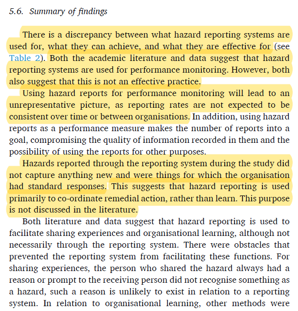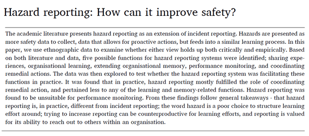 · And results suggest “that hazard reporting is used primarily to co-ordinate remedial action, rather than learn”