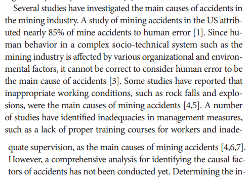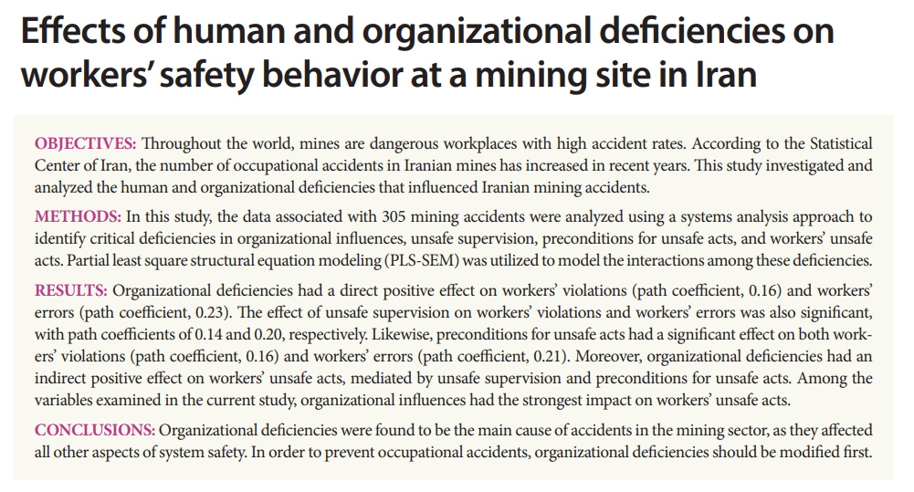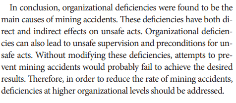 · ”organizational deficiencies were found to be the main causes of mining accidents” and these “deficiencies have both direct and indirect effects on unsafe acts”