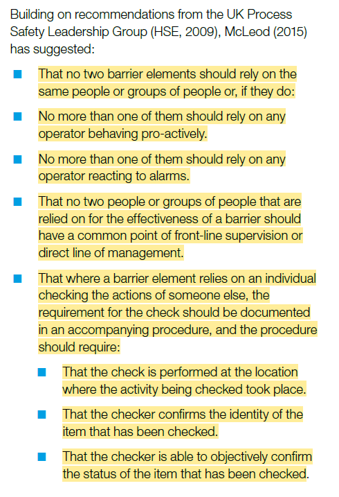 Not much to say here – I found the following excerpts from the CIEHF’s white paper on “Human Factors in Barrier Management” interesting, discussing the potentially misaligned assumptions of independence in verifications.