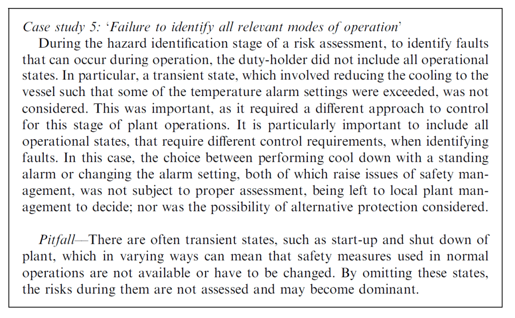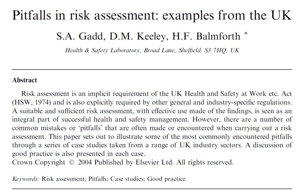 Authors: Gadd, S. A., Keeley, D. M., & Balmforth, H. F. (2004). Pitfalls in risk assessment: examples from the UK. Safety Science, 42(9), 841-857.