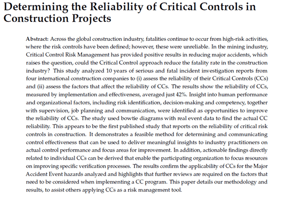 Authors: Selleck, R., Hassall, M., & Cattani, M. (2022). Determining the reliability of critical controls in construction projects. Safety, 8(3), 64.