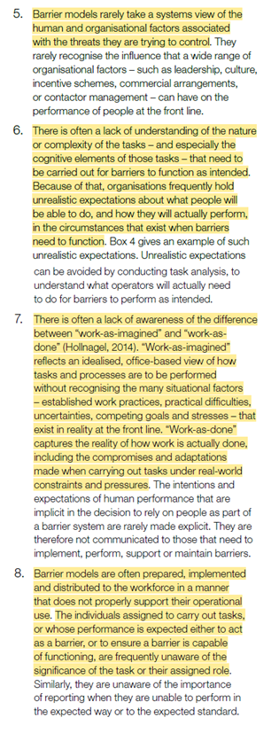 6. The cognitive elements of tasks are rarely considered and hence, organisations hold unrealistic expectations of what people will or won’t recognise or do, what they will or won’t assess, nor “how [people] will actually perform, in the circumstances that exist when barriers need to function”