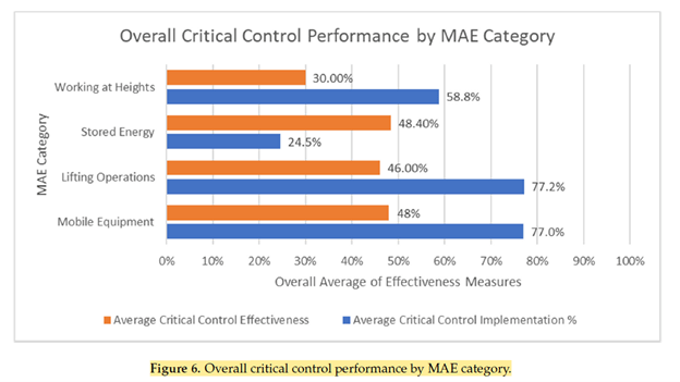 When implementation and effectiveness were assessed by MAE, mobile equipment and lifting operations had the strongest CC implementation rate. Stored energy had the lowest implementation rate overall.