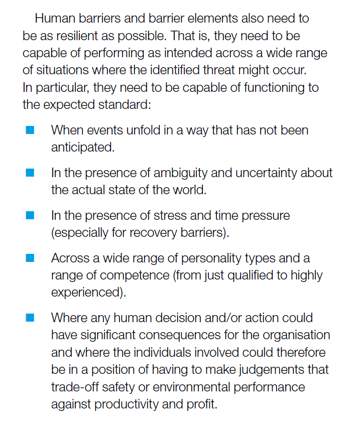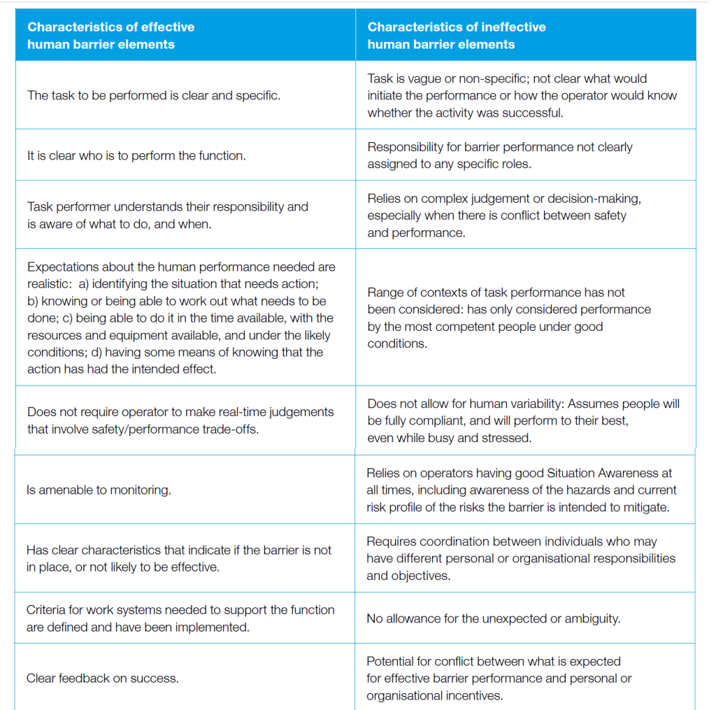 In this part, specific questions and prompts are provided around what makes for an effective human barrier element, like clear and specific task and goals. Most of this comes from the CIEHF ‘Human Factors in Barrier Management’,