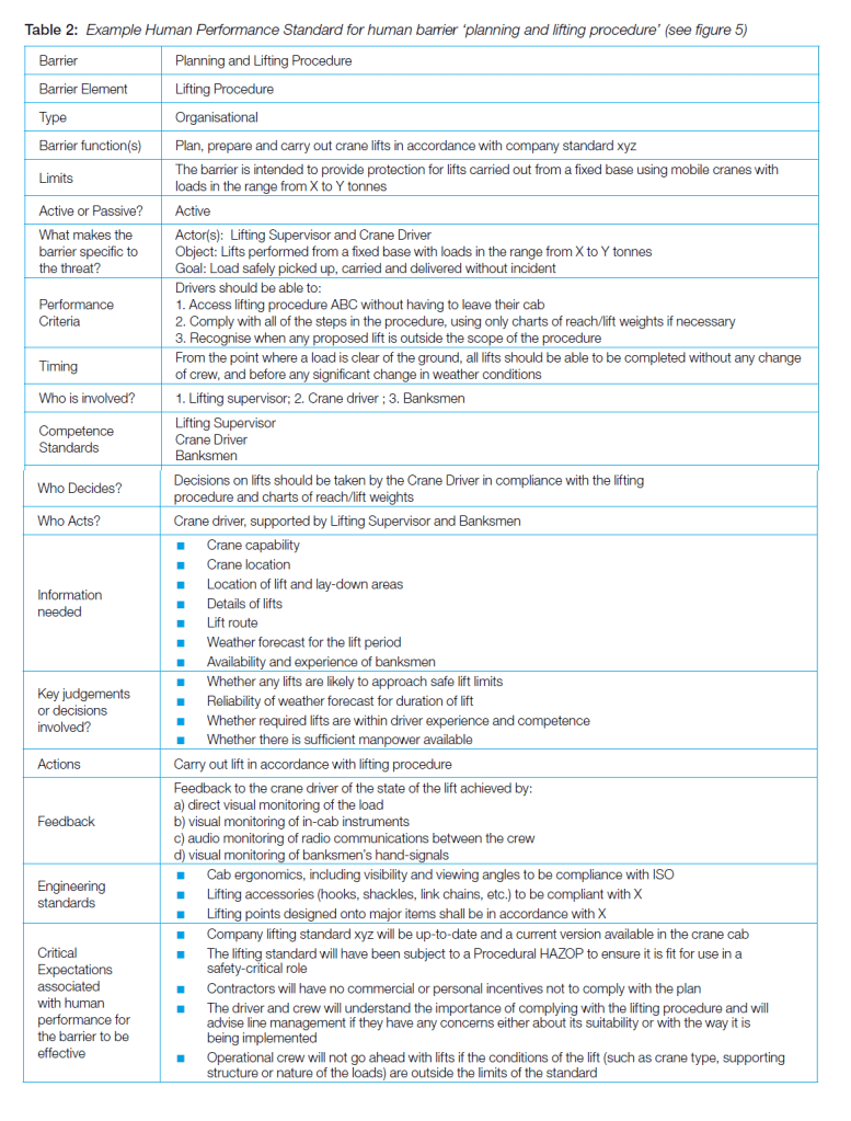 An example for specifying human performance for a lifting operation is provided, highlighting expectations on detect-decide-act, information and key decisions to be made, feedback, and any key critical expectations on human performance that’s needed for the barrier to be effective.