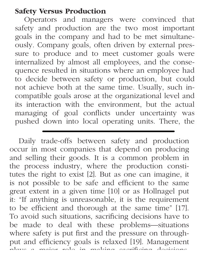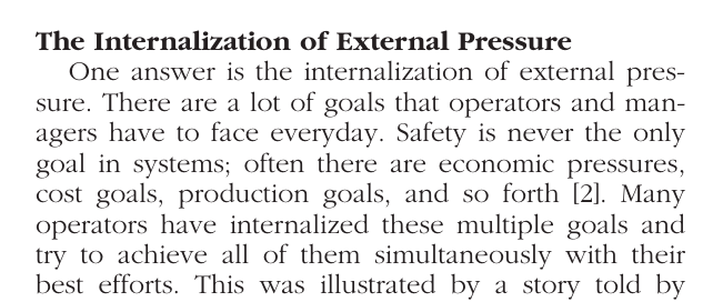 They go over goal conflicts and pressures again that workers and managers face every day. “Safety is never the only goal in systems”, with economic pressures cost, production and more. Many operators have “internalized these multiple goals and try to achieve all of them simultaneously with their best efforts”.