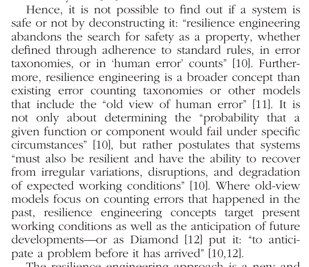 · They argue that “it is not possible to find out if a system is safe or not by deconstructing it”; hence, resilience engineering “abandons the search for safety as a property … and it considers the system as a whole”