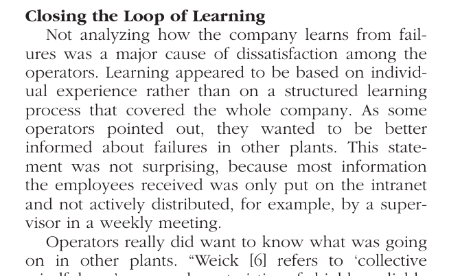 Operators didn’t really know what was happening in other plants but wanted to. The company relied on the intranet to distribute safety alerts etc.; hence, the company’s ability “the chance to create such a collective mindfulness relies on the intranet as a single source”.