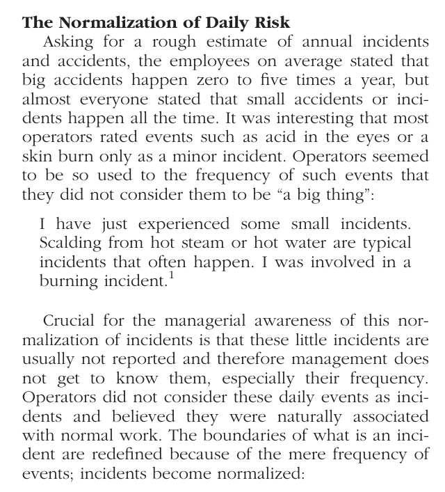 They argue that crucial for managers to be aware is that this normalisation of risk exists, and is normally not reported when events happen. Workers didn’t “consider these daily events as incidents and believed they were naturally associated with normal work”.