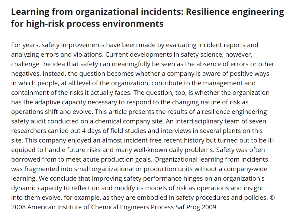This study undertook field studies across several plants to understand whether an “almost incident-free” chemical company had the adaptive capacities necessary to respond to changing risks, using a Resilience Engineering perspective.