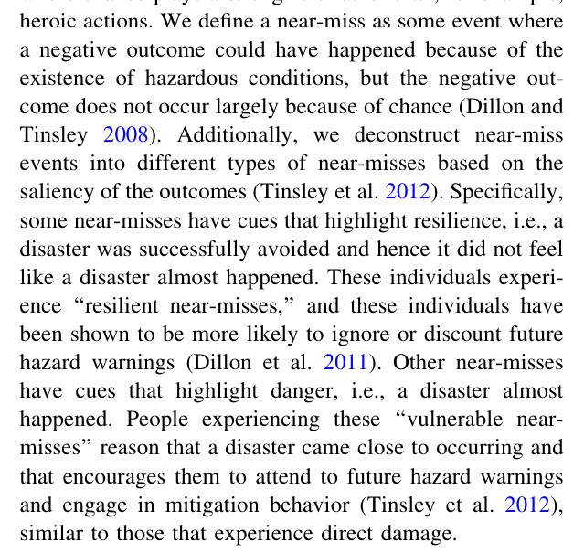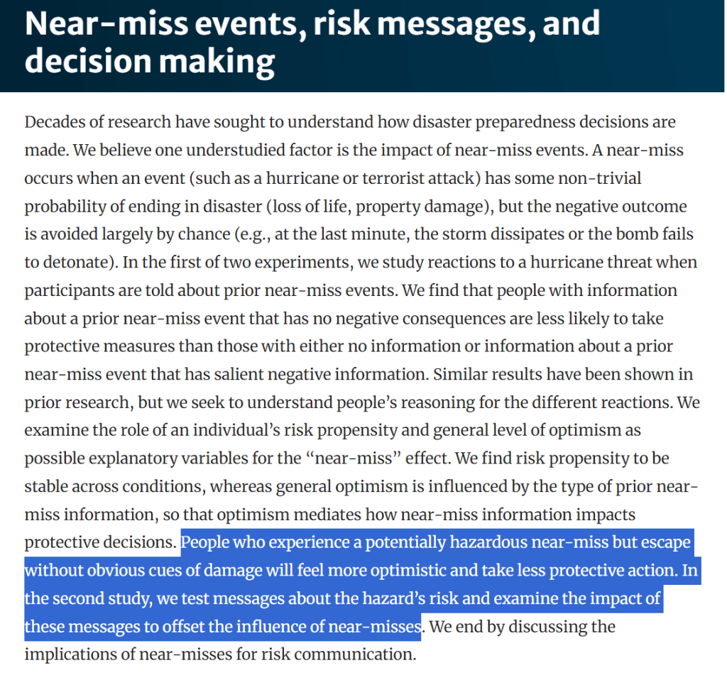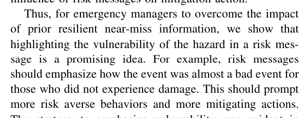 They suggest that for emergency managers and the like to overcome the negative impact of some types of near miss events, they could highlight how the event “was almost a bad event for those who did not experience damage”; a near failure rather than a near success.