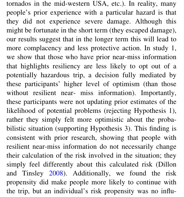 Further, people with prior near-miss info that highlights the averted disaster as success are less likely to opt out of a potentially hazardous trip. However, people don’t necessarily update their prior estimates of the likelihood of potential problems (e.g. no evidence for a Bayesian approach) but they rather feel differently about the statistical risk.