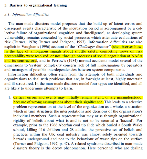 It’s not that the organisation didn’t care about safety – it did – but in hindsight wasn’t focusing on the critical factors that led to this particular disaster. Turner, in part, explained this is a ‘perceptual horizon’ (which describes the things that are seen as important or significant to individuals and organisations) and ‘decoy phenomena’ (which describes how organisations when attending to certain issues or hazards are distracted from other more relevant issues or misled into believing that the issue has now been resolved; issues act as decoys from other more pertinent issues relating to that failure – usually known in hindsight).