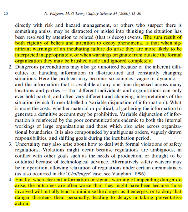 Pidgeon & O’Leary (2000, Safety Science, 34), drawing on Barry Turner’s man-made disaster theory, provide context on how organisations can become blind to these types of danger (see attached images).