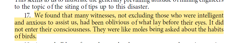 “We found that many witnesses… had been oblivious of what lay before their eyes. It did not enter their consciousness. They were like moles being asked about the habits of birds.” (emphasis added)