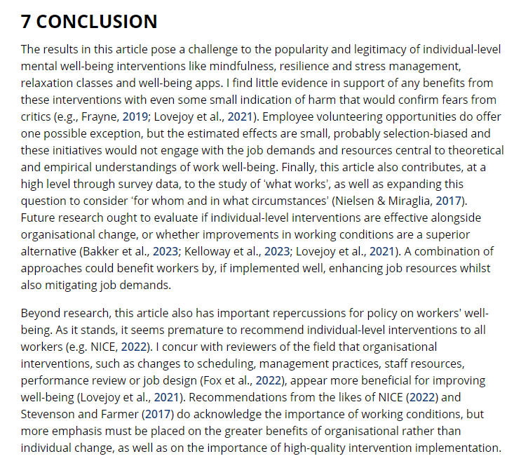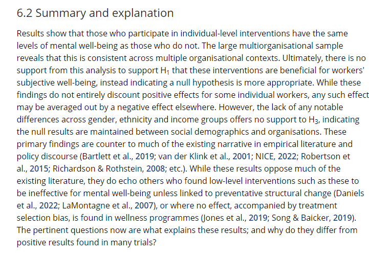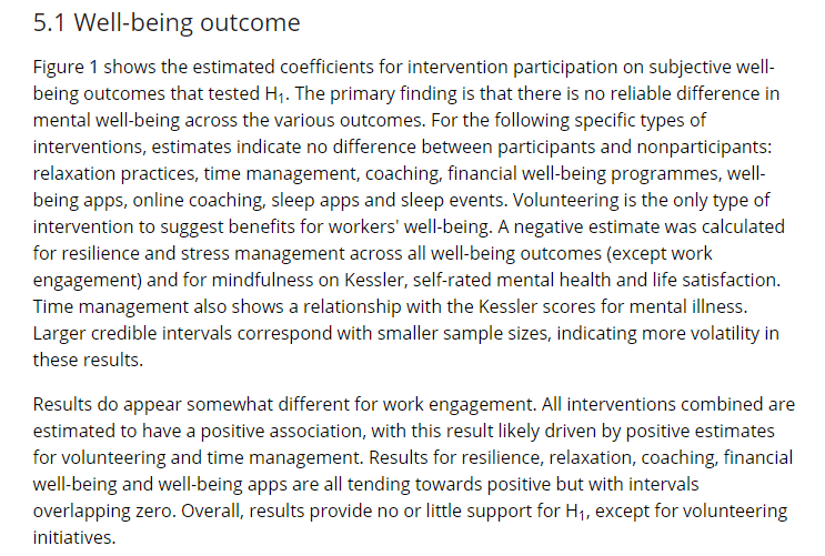 · Finally, “there is no support from this analysis to support [hypothesis 1] that these interventions are beneficial for workers’ subjective wellbeing, instead indicating a null hypothesis is more appropriate”