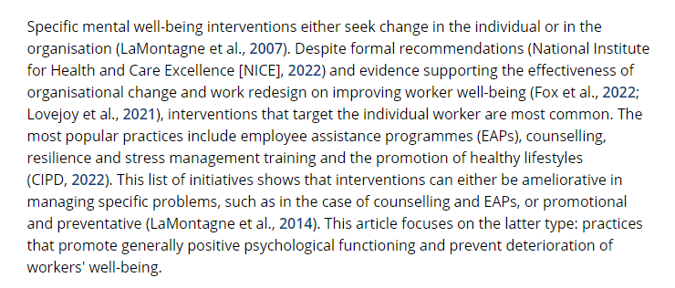 They included interventions like resilience and stress training, mindfulness, well-being apps, EAPs, counselling.