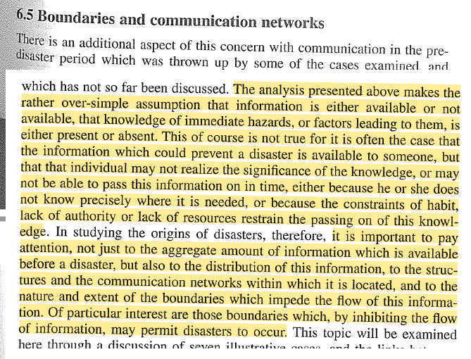 · It’s cautioned that we should pay attention not just to what information is available, but its distribution, the communication networks in place, and to the boundaries that impede information flow; of which may ‘permit disasters to occur’