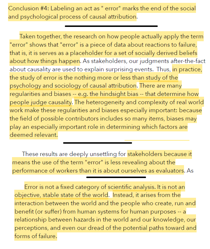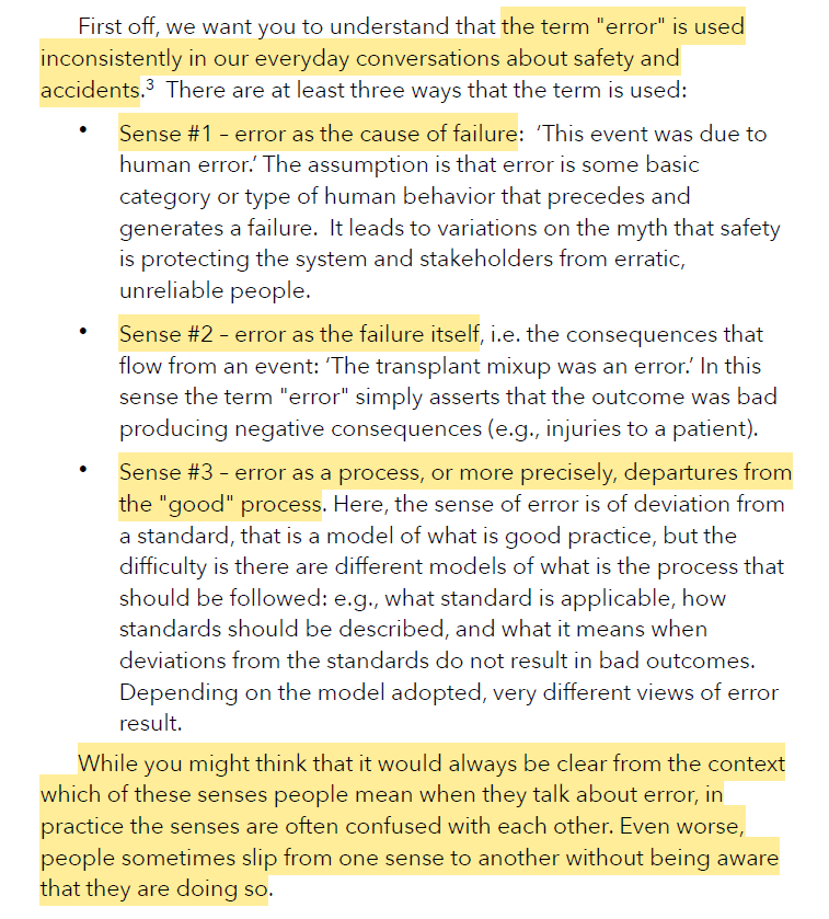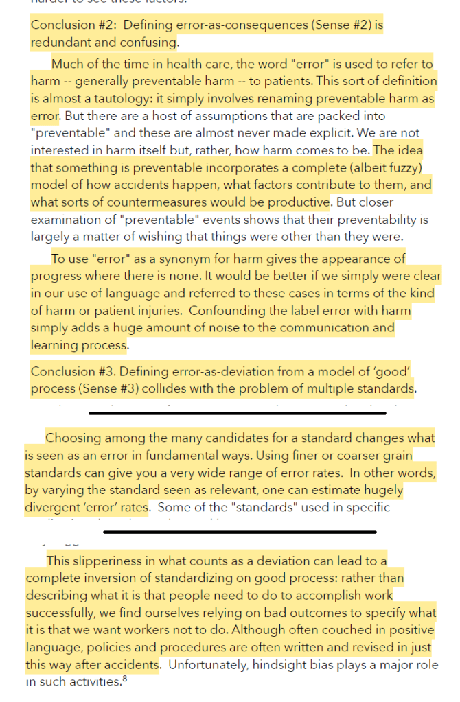 · Conclusion 2) defining error as consequences is redundant and confusing. They argue that conflating error with harm incorporates a fuzzy model of how accidents happen, and gives the appearance of progress where there’s none. Instead, just stick with clear language