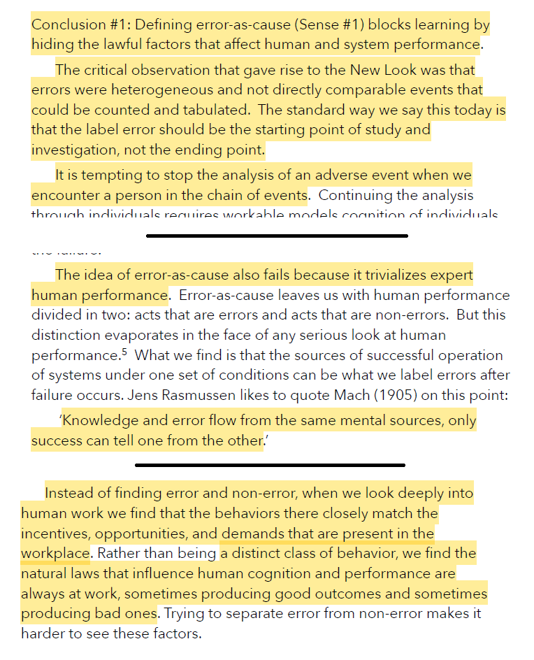 · Conclusion 1) defining error as a cause blocks learning by hiding the lawful factors that affect human and system performance. Moreover, errors aren’t heterogeneous and not directly comparable events for counting and tabulating, and they may trivialise expert human performance