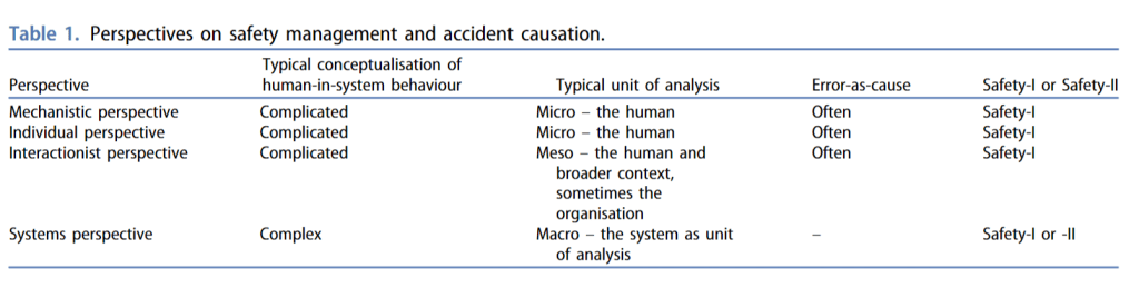 It’s said that a range of systems ergonomics theories and methods exist to support this shift. Here they provide a table of factors of how human error construct is defined in terms of systems thinking – mostly highlighting its inadequacies for complex systems.