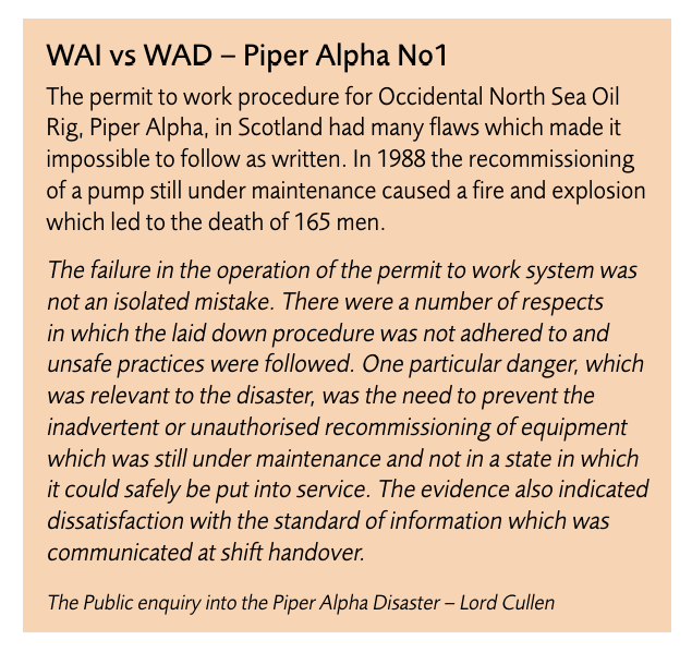 - In reality, “only in very special cases is real work completely regular or orderly and perfectly described by rules”, and WAD will “always be different from work-as-imagined (WAI) because it is impossible to know in advance what the actual conditions of work will be”