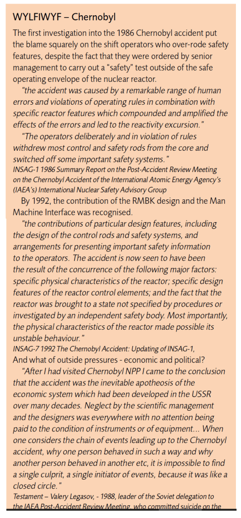 - WYLFIWYF (What-You-Look-For-Is-What-You-Find): The assumptions about causes are, largely, determine what lessons are learned. The assumptions are sometimes explicit but often not. Assumptions about causality have changed over time, for instance the age of technology was an earlier age dominated by accidents caused by technology failure