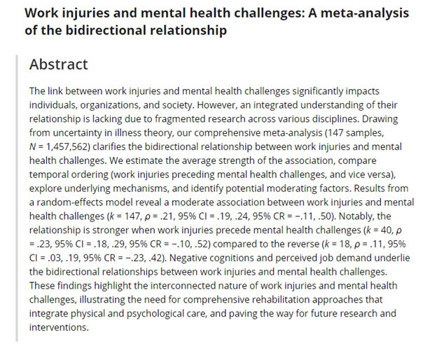 Granger, S., & Turner, N. (2024). Work injuries and mental health challenges: A meta‐analysis of the bidirectional relationship. Personnel Psychology.
