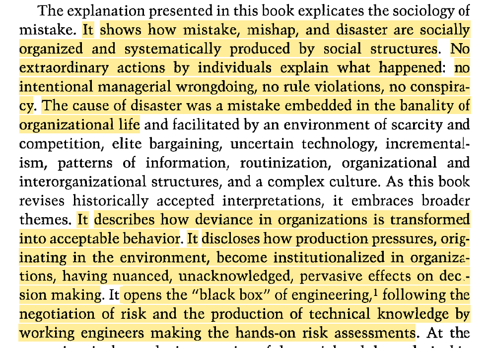 · “mistake, mishap, and disaster are socially organized and systematically produced by social structures”